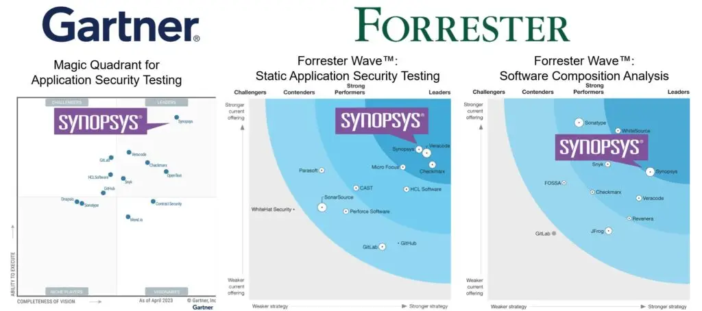 Black Duck (eski adı ile Synopsys), 2023’de dahil olmak üzere, Gartner® Magic Quadrant for Application Testing tarafından üst üste 7 yıldır ‘lider’ olarak seçilmiştir. Synopsys ayrıca, SAST ve SCA alanlarında 2023 Forrester Wave’de™ Liderdir.